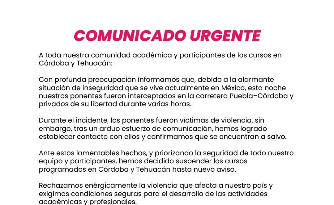 Institución suspende cursos tras privación de la libertad de ponentes en autopista 150D Puebla-Córdoba