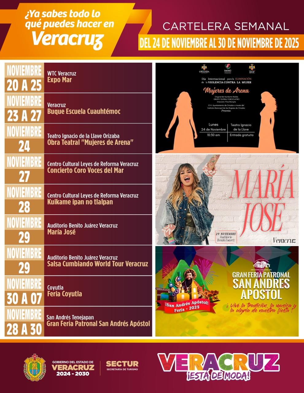 Con esta variada cartelera, Veracruz reafirma su papel como un destino vibrante que combina tradición, arte, música y desarrollo cultural, invitando a vivir nuevas experiencias cada semana.