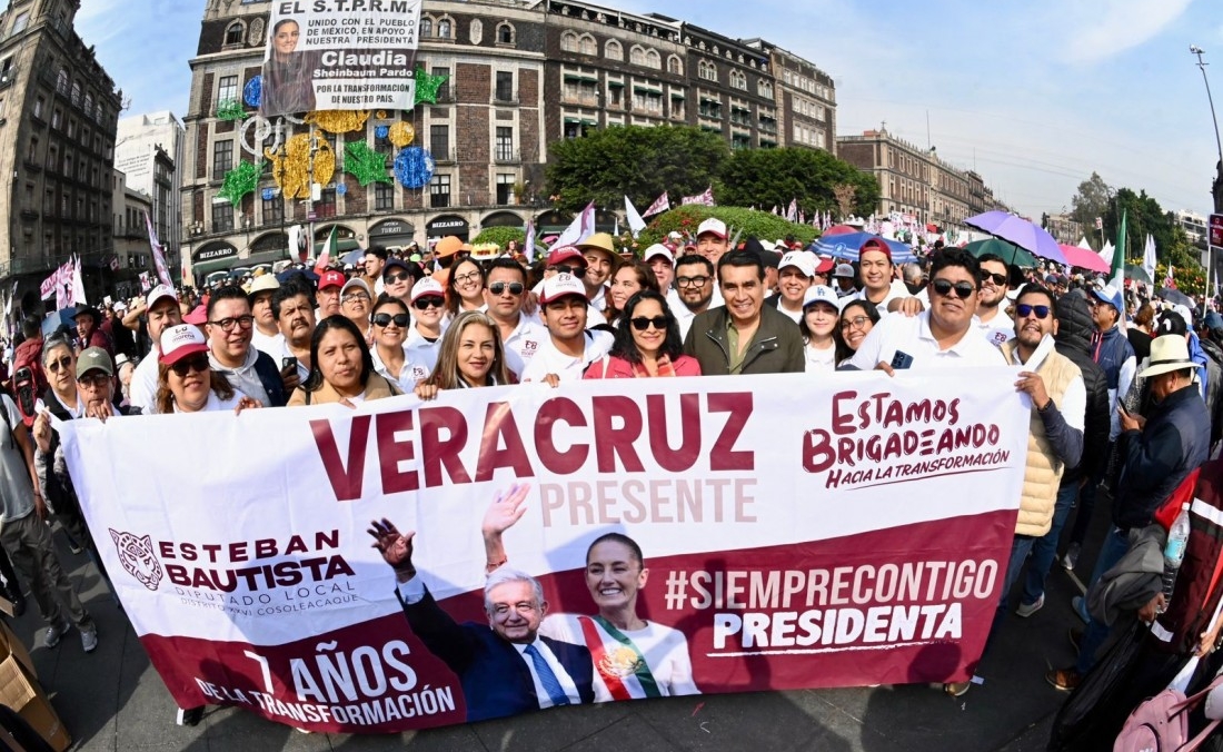 Al zócalo capitalino, el profesor Esteban Bautista acudió al frente de un importante contigente de personas del estado de Veracruz, principalmente de la región sur, quienes reiteraron su respaldo a la presidenta Claudia Sheinbaum Pardo.