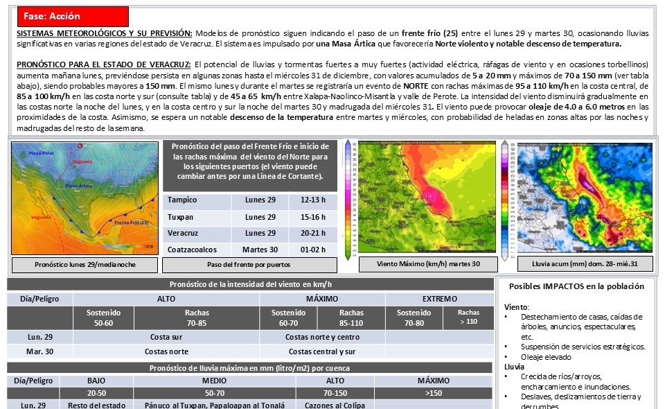 Alerta Gris por lluvias intensas y evento de Norte: PCXalapa, Ver., domingo 28 de diciembre de 2025.– La Secretaría de Protección Civil (PC) informa que, ante el pronóstico para este lunes de lluvias con acumulados probables superiores a 150 milímetros en algunos puntos de la entidad, así como un evento de Norte con rachas máximas de hasta 110 kilómetros por hora en la costa central, se mantiene activa la Alerta Gris del Sistema de Alerta Temprana de Veracruz (SIATVer), en su Fase de Acción.