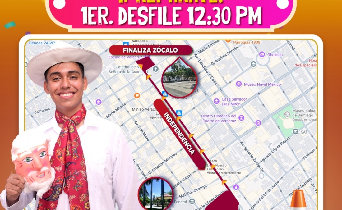 En punto de las 12:30 horas dará inicio el primer desfile Despide el Año Viejo en Veracruz; los contingentes partirán del Parque Zamora, avanzando sobre la calle Independencia, pasando frente al Zócalo de la ciudad para culminar sobre Montesinos.