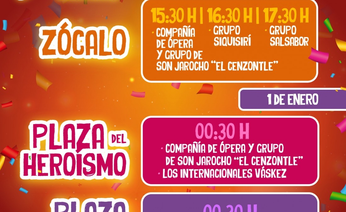 Para la celebración de la media noche, la Plaza del Heroísmo recibirá a la Compañía de Ópera y Grupo de Son Jarocho El Cenzontle, así como a Los Internacionales Váskez, a partir de las 00:30 horas. En ese mismo horario, la Plaza Magisterial contará con un elenco integrado por la Orquesta SL, un DJ y la música del Camarón y sus Teclados.