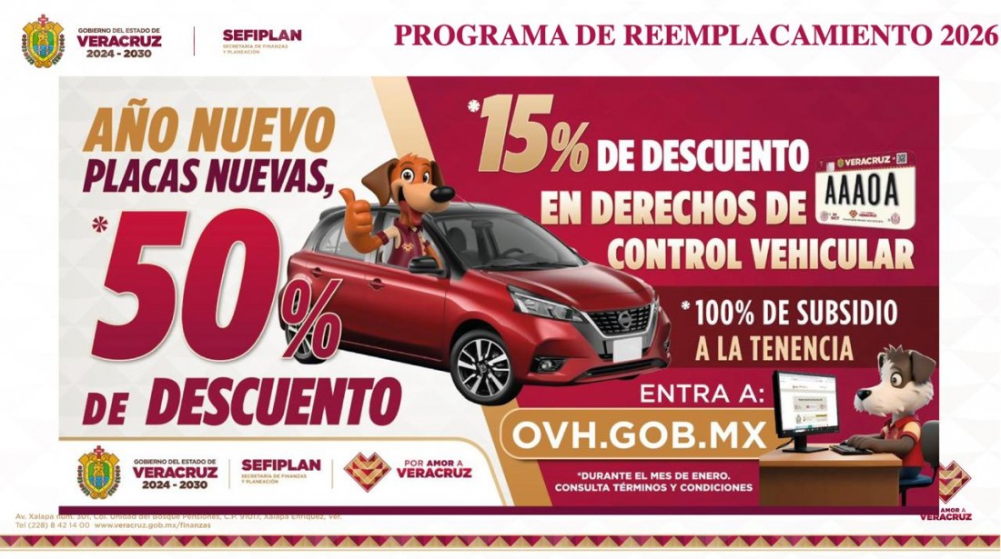 Es así que desde el primero de enero y al 31 de diciembre de 2026 el Gobierno de Veracruz implementará el Programa de Reemplacamiento, estrategia para actualizar el Padrón Vehicular, fortalecer la seguridad vial y brindar certeza jurídica a las personas propietarias de vehículos, con descuentos de hasta 50 por ciento, condonación de recargos y facilidades digitales.