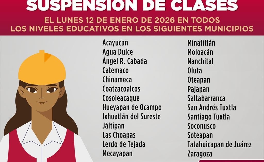 Es así que los planteles públicos desde preescolar, primeria, secundaria, media superior y superior, no tendrán actividades este lunes en los municipios de Acayucan, Agua Dulce, Ángel R. Cabada, Catemaco, Chinameca, Coatzacoalcos.