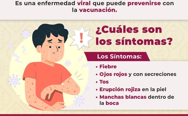 Cabe mencionar que el sarampión es una enfermedad viral muy contagiosa que provoca fiebre alta, tos, ojos rojos y una erupción cutánea que empieza en la cara y se extiende por todo el cuerpo, con síntomas similares a los de la gripe.