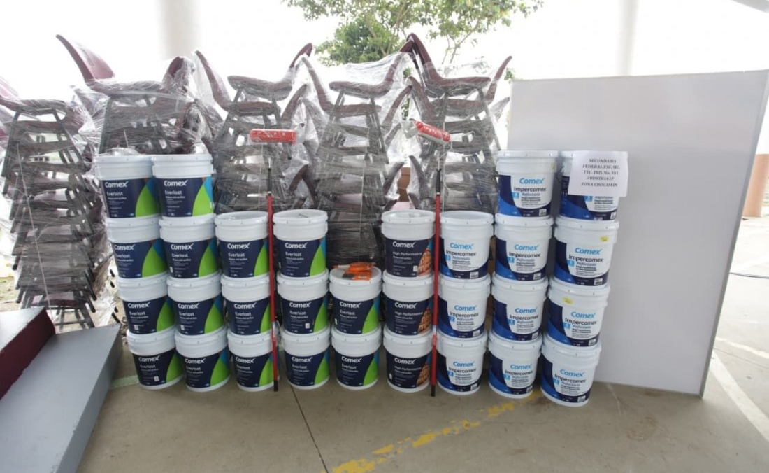 La entrega incluyó mil 245 cubetas de pintura, 950 de impermeabilizante, 3 mil 948 sillas para mesa trapezoidal, mil 974 mesas trapezoidales, 340 pizarrones y 61 pantallas, destinados a 62 primarias, 10 secundarias federales y 16 telesecundarias.