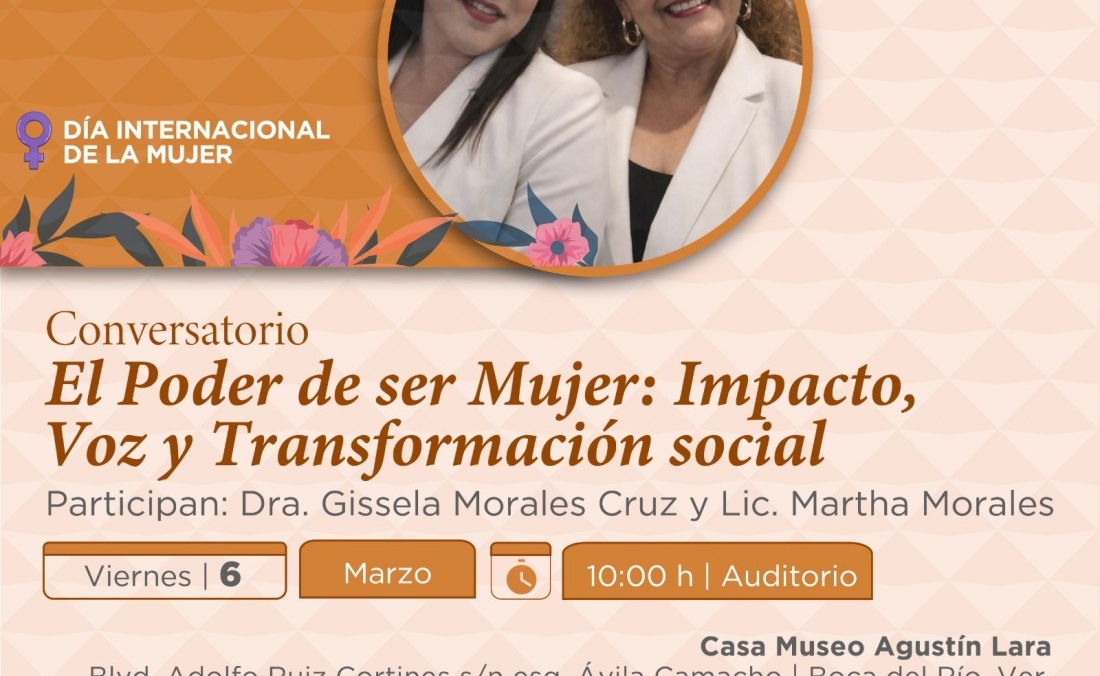 RedacciónLa Secretaría de Cultura de Veracruz (SECVER) invita al Conversatorio El poder de ser mujer: impacto, voz y transformación social, que se llevará a cabo mañana a las 10:00 horas, en el Auditorio de la Casa Museo Agustín Lara, en Boca del Río, en el marco del Día Internacional de la Mujer. La entrada es libre.