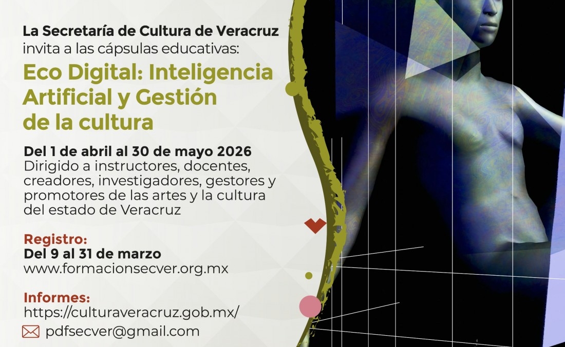 RedacciónLa Secretaría de Cultura de Veracruz (SECVER) invita al público a participar en la serie de cápsulas educativas Eco Digital: Inteligencia Artificial y Gestión de la Cultura 2026, que se transmitirá del 07 de abril al 30 de mayo a través de la Plataforma Digital de Formación SECVER, disponible en el portal https://www.formacionsecver.org.mx/.