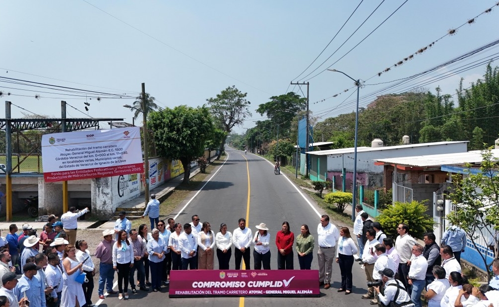Atoyac, Ver., sábado 25 de abril de 2026.– La gobernadora Rocío Nahle García encabezó la entrega de la rehabilitación del tramo carretero Atoyac – General Miguel Alemán – entronque 150D Córdoba, obra que cumple un compromiso con la población y consolida la presencia de la Cuarta Transformación en la región centro del estado.“La palabra se cumple”, afirmó al recordar que, en campaña, las y los habitantes le solicitaron rescatar esta vía, abandonada por más de 30 años, pese a ser fundamental para la movilidad y la actividad cañera vinculada al ingenio El Potrero.