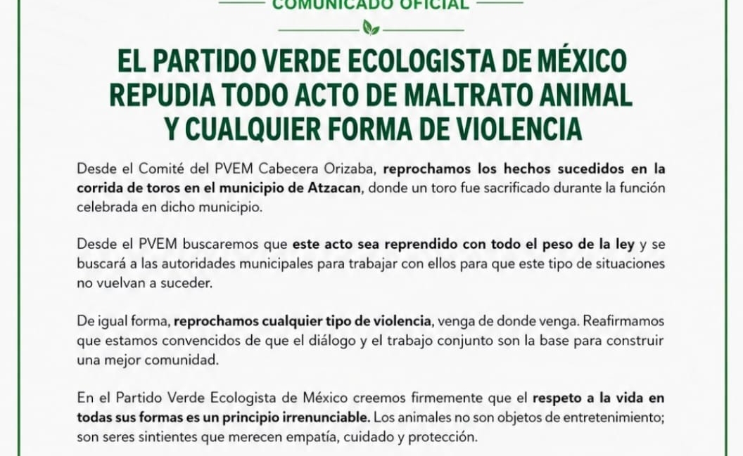 “El PVEM condena cualquier forma de violencia y reitera que los animales no deben ser considerados objetos de entretenimiento”, subrayó.
