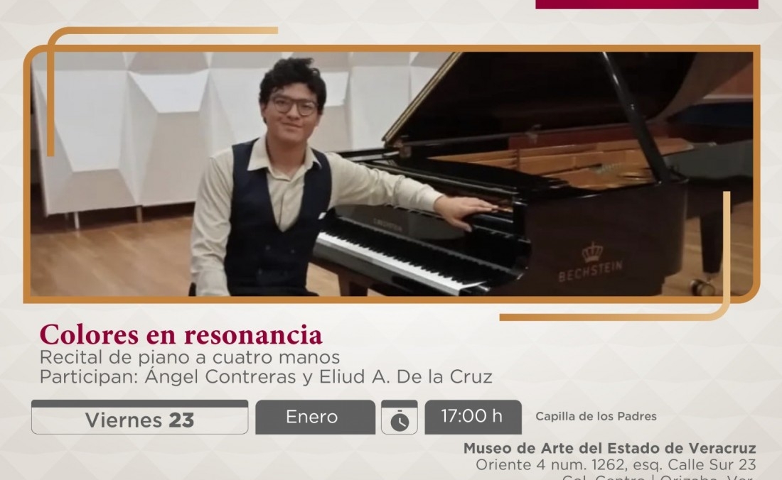 Este concierto a cuatro manos estará a cargo de Ángel Contreras y Eliud de la Cruz, jóvenes talentos veracruzanos que interpretarán piezas de Beethoven, Mozart, Chopin, Debussy, Saint-Saëns y Darius Milhaud