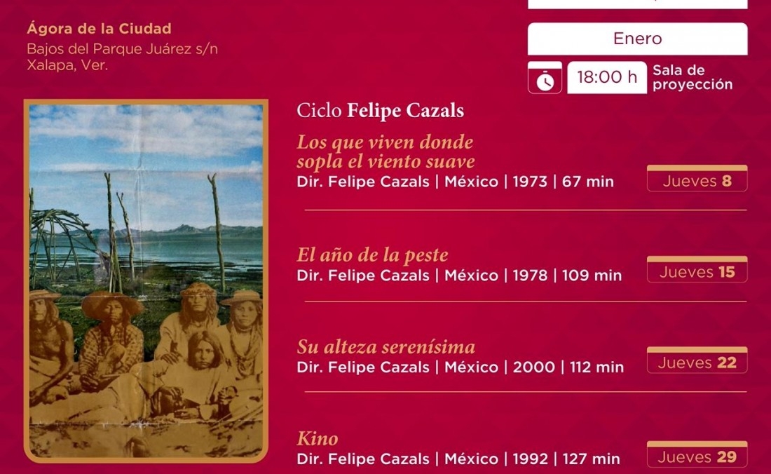 Las proyecciones en torno a la producción cinematográfica del director Felipe Cazals, los jueves 8, 15, 22 y 29 de enero a las 18:00 horas, en el Ágora de la ciudad. La entrada es libre